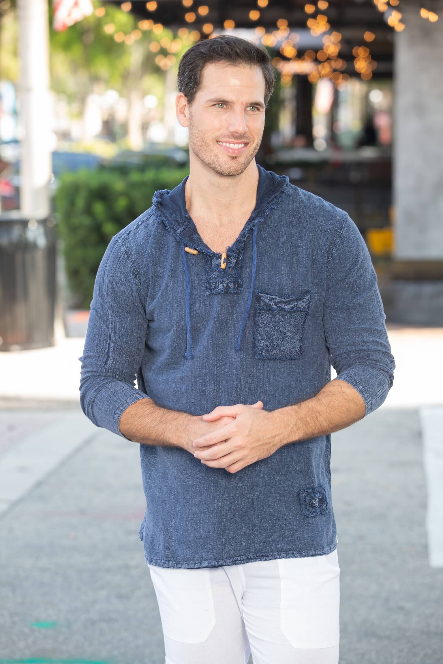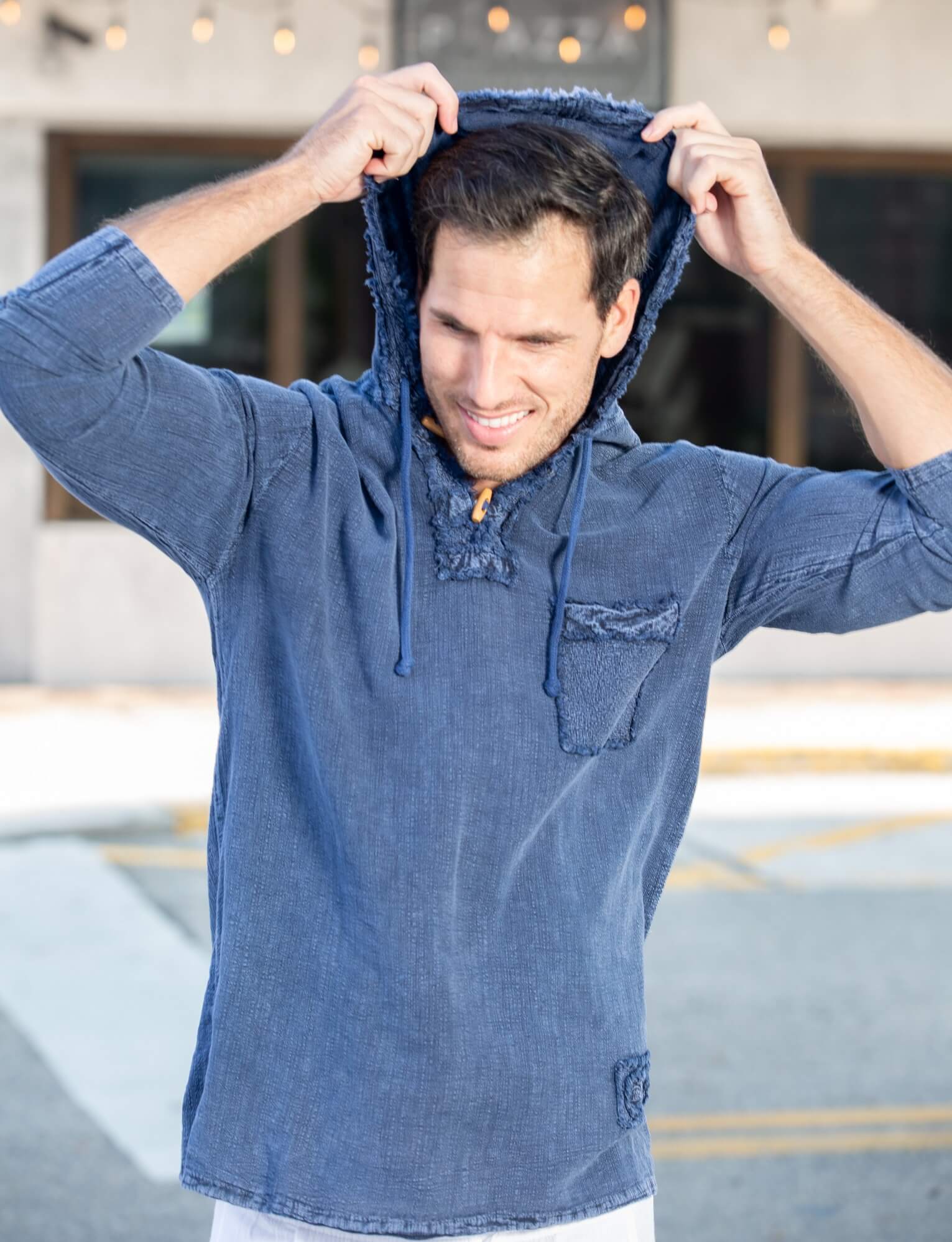 S E A S I C K cool and casual Men’s hoodie long sleeve shirt. Fringe on hoodie and pocket, a small front patch, crease down sleeves. Made from the finest Peruvian Pima Cotton. Soft and comfortable, breathable relaxed fit. With a side hemline slits.